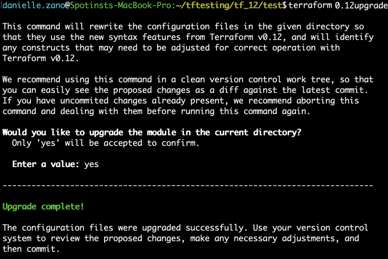 • Run terraform 0.12upgrade within a fully-initialized working directory that contains the TF files.